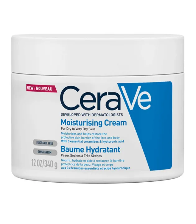 CeraVe Moisturizing Cream for Dry to Very Dry Skin (340g) is a rich, non-greasy, and fast-absorbing moisturizer developed with dermatologists to provide long-lasting hydration and restore the protective skin barrier. Ideal for dry to very dry skin on the face and body, this cream is formulated with three essential ceramides (1, 3, and 6-II) and hyaluronic acid to help retain skin’s natural moisture. The unique MVE Technology releases moisturizing ingredients over 24 hours, ensuring continuous hydration throughout the day. Fragrance-free, non-comedogenic, and gentle on sensitive skin, CeraVe Moisturizing Cream delivers deep nourishment while supporting skin health — making it a trusted choice for both daily care and skin barrier repair.