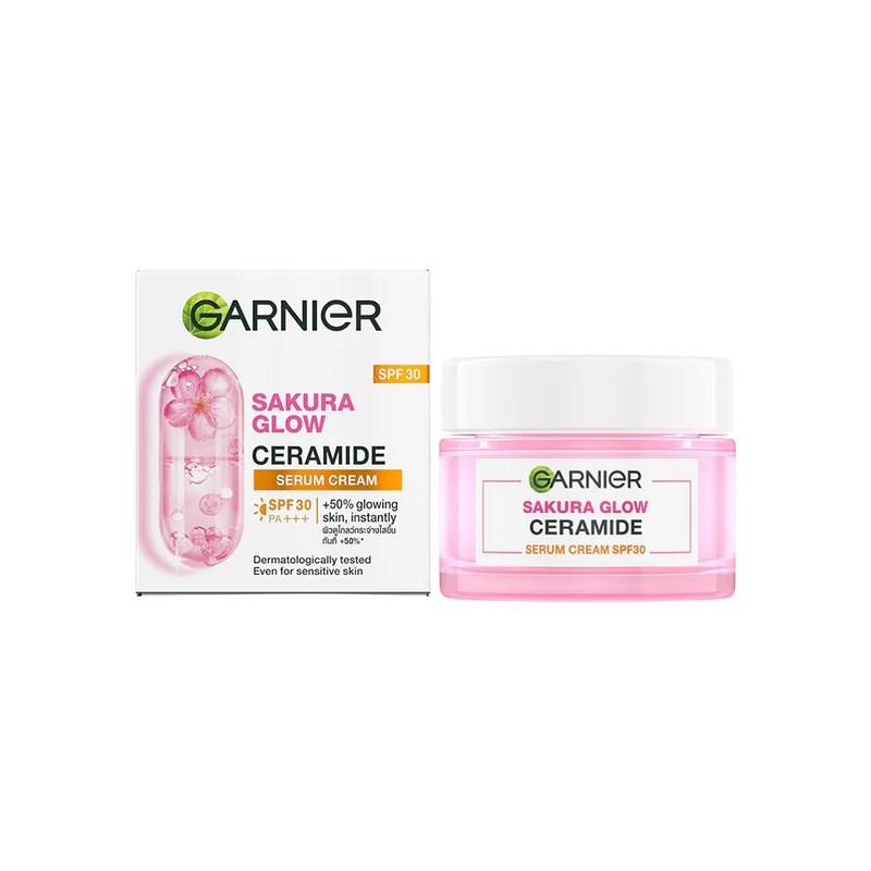 Garnier Sakura Glow Ceramide Serum Cream SPF 30 is a lightweight, multi-functional daytime cream designed to hydrate, brighten, and safeguard your skin from UV damage. It combines the soothing benefits of Japanese Sakura extract with skin barrier‑strengthening ceramides and SPF 30 protection. The Garnier Sakura Glow Ceramide Serum Cream SPF 30 offers a range of key benefits designed to enhance your skin’s natural radiance while providing essential protection and care. Enriched with Japanese Sakura extract, it helps brighten dull skin and promote a healthy, luminous glow. Ceramides and hyaluronic acid deeply hydrate the skin and strengthen the skin barrier, ensuring long-lasting moisture and resilience against environmental stressors. With broad-spectrum SPF 30 and PA+++ protection, it effectively shields the skin from harmful UVA and UVB rays, helping to prevent sun damage and premature aging. The lightweight, non-greasy texture absorbs quickly, making it ideal for daily use—even under makeup—while niacinamide works to refine skin texture and even out tone for a smoother, more radiant complexion.