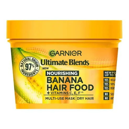 Garnier Ultimate Blends Banana Hair Food 3-in-1 Dry Hair Mask Treatment 400ml is a rich, creamy hair care essential created to bring life back to dry, tired, and rough-feeling hair. Infused with nourishing banana extract and conditioning ingredients, this deeply hydrating formula melts into the hair to restore softness, smoothness, and natural shine. Its lightweight yet intensely moisturizing texture helps reduce frizz, improve manageability, and leave hair feeling silky without weighing it down. Designed as a versatile 3-in-1 treatment, it can be used as a conditioner, a deep-nourishing rinse-out mask, or a leave-in cream for extra moisture and control throughout the day. With a vegan formula made from mostly natural-origin ingredients and free from silicones, it delivers gentle yet effective care while surrounding your hair with a delicious fruity fragrance that makes every use feel fresh and indulgent.